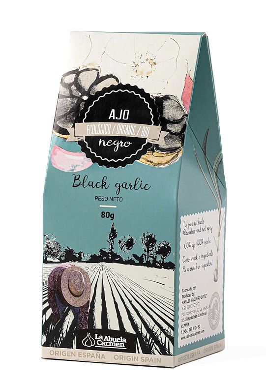 Černý česnek od La Abuela Carmen je gurmánský produkt pro milovníky skvělého jídla a výjimečných chutí. Jedná se o delikatesu vyrobenou pomalou fermentací klasického česneku. Při dlouhém zrání v kontrolované teplotě a vlhkosti dochází k tzv. maillardově reakci – přirozenému propojení cukrů a bílkovin, které dodává stroužkům sametově černou barvu, měkkou konzistenci a chuť plnou sladkých tónů připomínajících sušené ovoce, balzamikový ocet či karamel. Nezanechává typický česnekový dech, a proto si získává oblibu i u těch, kteří se běžnému česneku vyhýbají.