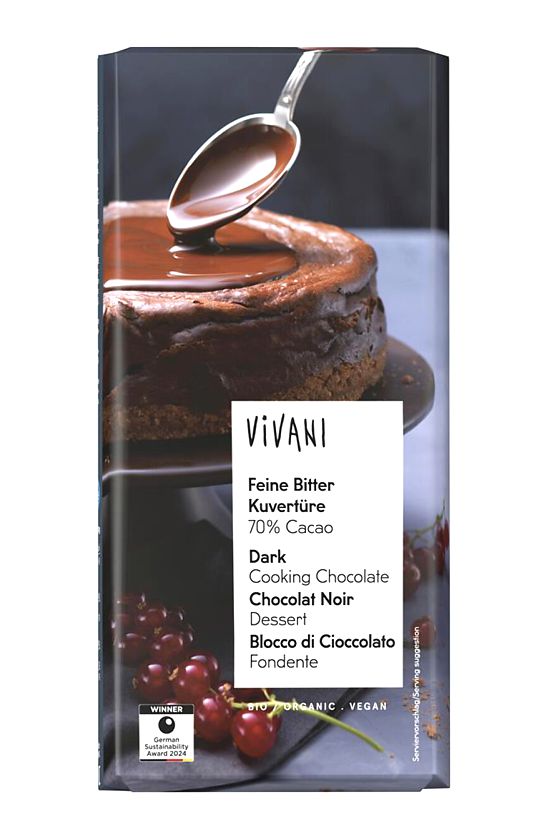 Bio hořká čokoláda na vaření Vivani obsahuje minimálně 70 % kakaové sušiny a je vyrobena pouze z kakaové hmoty, kakaového másla a přírodního třtinového cukru. Neobsahuje žádné náhražky, ztužené tuky ani umělá aromata, což jí dodává čistý, autentický charakter. Díky vysokému podílu kakaa má intenzivní, plnou chuť s jemně nahořklým profilem, který ocení každý milovník kvalitní čokolády.