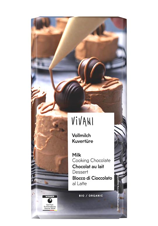 Bio mléčná čokoláda na vaření Vivani obsahuje minimálně 35 % kakaové sušiny. Je vyrobena z kakaové hmoty, kakaového másla, sušeného plnotučného mléka a přírodního třtinového cukru, doplněná o jemný výtažek z bourbonské vanilky. Neobsahuje žádné náhražky ani umělá aromata, pouze pravé kakao a kvalitní bio suroviny. Díky vyváženému podílu kakaa nabízí jemnou, krémovou chuť s mléčným profilem, která se hodí jak pro cukrářské využití, tak jako rychlá sladká sváča.