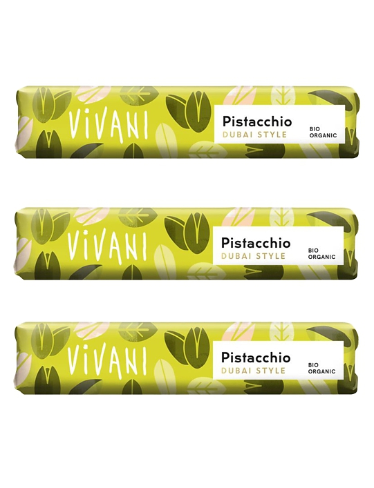 Co vůbec je Dubajská čokoláda? Je to virální trend čokoládové tabulky s tekutým pistáciovým krémem, křupavými nudlemi z těsta kadaif a sezamovou pastou tahini. Proslavila ji dubajská cukrárna Fix Dessert Chocolatier (zakladatelka Sarah Hamouda) a za masivní šíření vděčí TikToku. Tato tyčinka Vivani na trend odkazuje stylem: staví na pistáciově krémovém profilu a kontrastu sladko-slaného s křupavou texturou, ale nepoužívá kadaif ani tahini; jde o inspirovanou variaci vhodnou jako malá gurmánská svačina, rychlá energie do ruky, malé potěšení s espressem či dezertním vínem, nebo jako dárkový „ochutnávkový“ kousek.